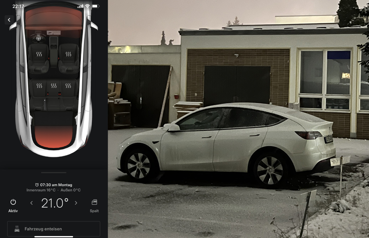 Nie wieder frieren II: Die Klimafunktion ist phänomenal. Entweder Zeit/Ortsgesteuert oder spontan per Klick in der App.